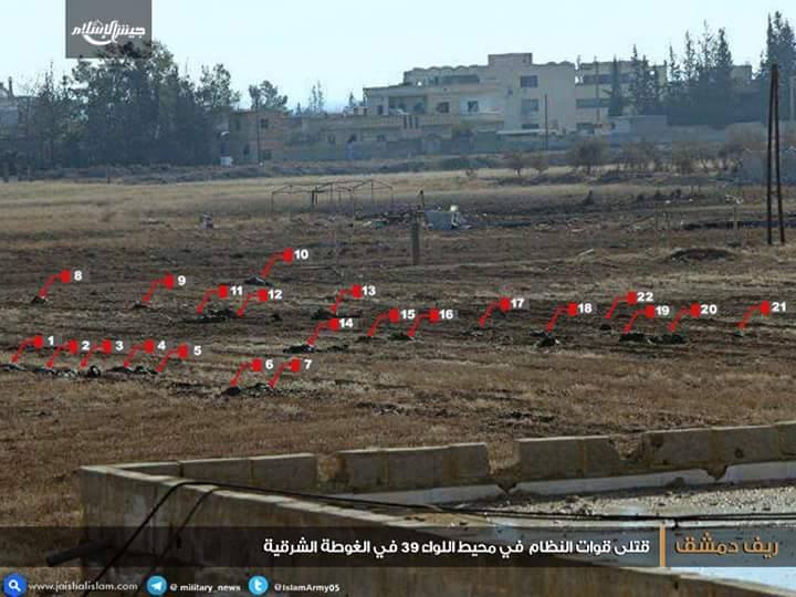 نشر المكتب الإعلامي التابع لجيش الإسلام عدداً من الصور تعود لجثث عناصر قوات الأسد التي حاولت اقتحام المناطق الخاضعة لسيطرة المعارضة السورية في محيط اللواء 39 بالغوطة الشرقية بريف دمشق .