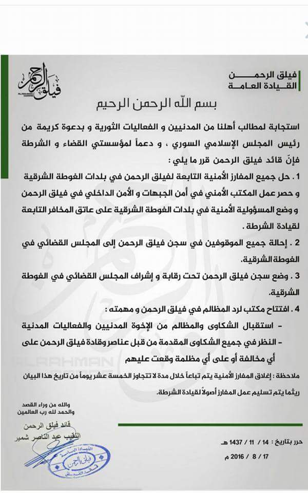 وتلبيةَ لمطالب المدنيين والفعاليات الثورية و المجلس الإسلامي السوري , صدر قرار من قائد فيلق الرحمن النقيب "عبد الناصر شمير" يحوي أربعة بنود في حال تطبيقها , لربما تدخل الغوطة في ايطار الدولة المدنية الديمقراطية .