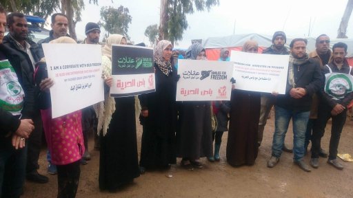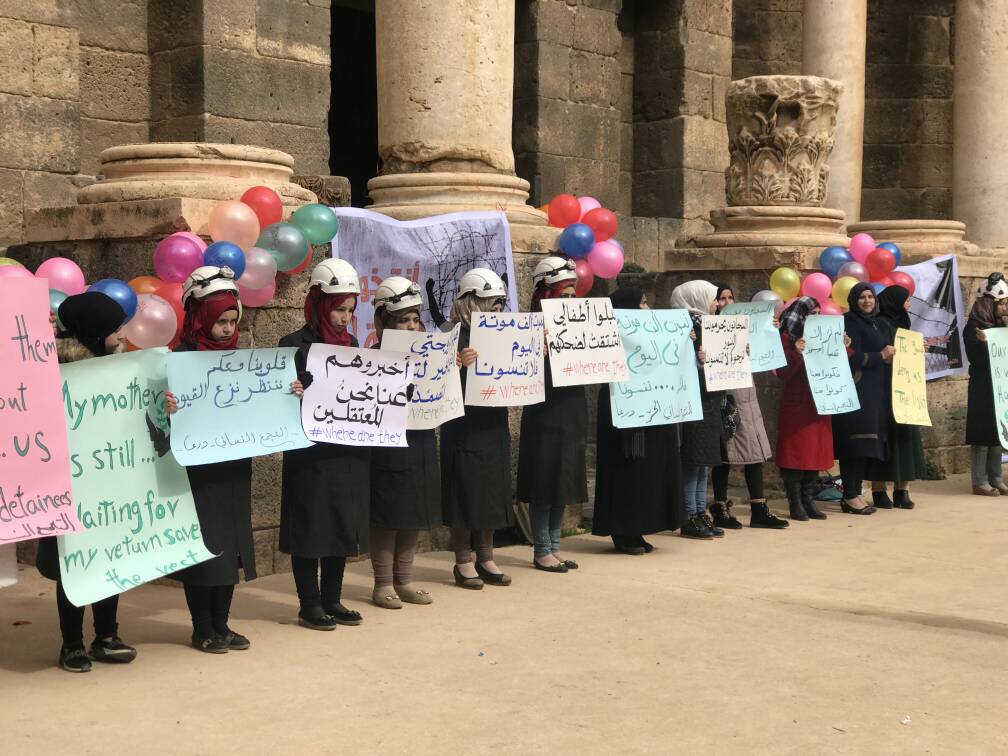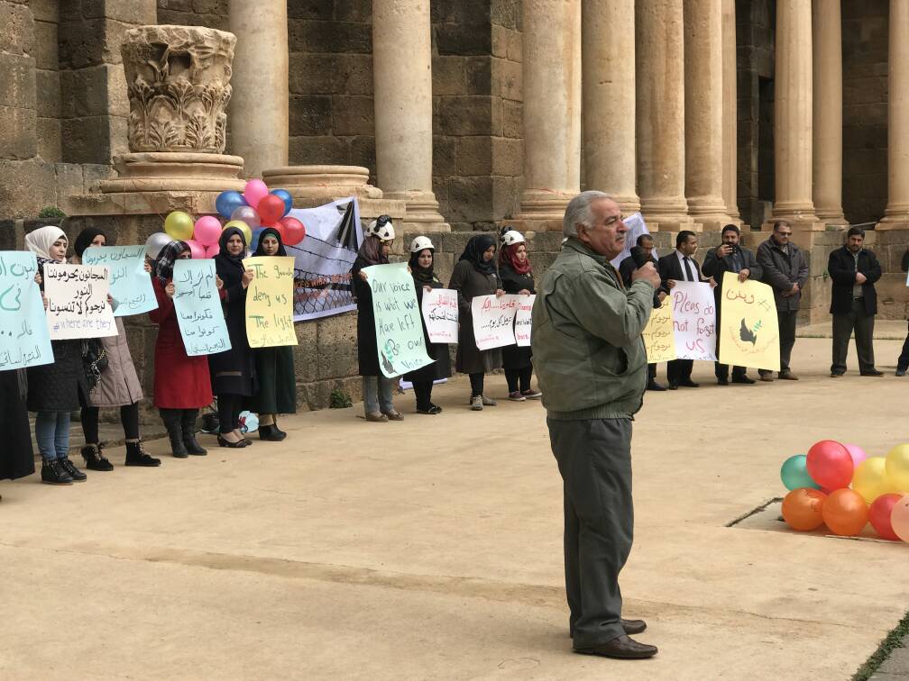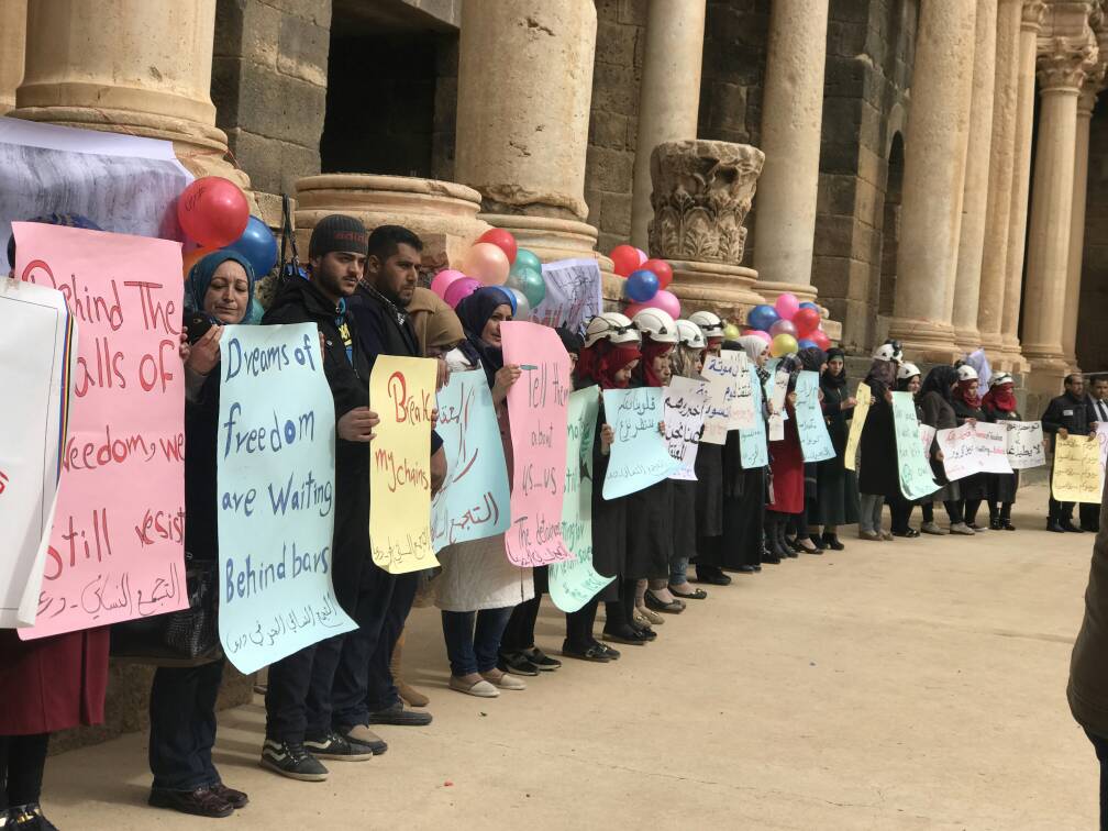 التجمع النسائي الحر في محافظة درعا ينظم وقفة تضامنية في مدينة بصرى الشام تضامنا مع المعتقلين في سجون الأسد .