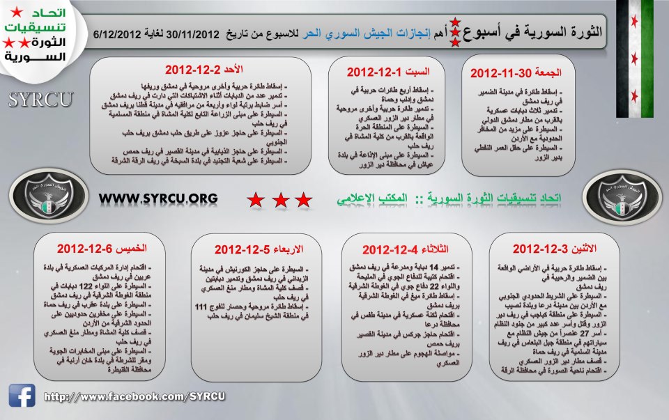إحصائية ترصد أهم انجازات أبطال الجيش الحر خلال الأسبوع المُنصرم من تاريخ 30 تشرين الثاني 2012 لغاية 6 كانون الأول 2012