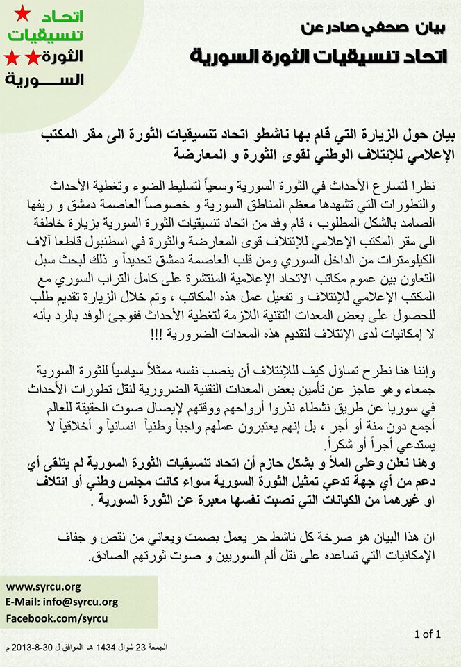 بيان حول الزيارة التي قام بها ناشطو اتحاد تنسيقيات الثورة إلى مقر المكتب الإعلامي للإئتلاف الوطني لقوى الثورة و المعارضة .