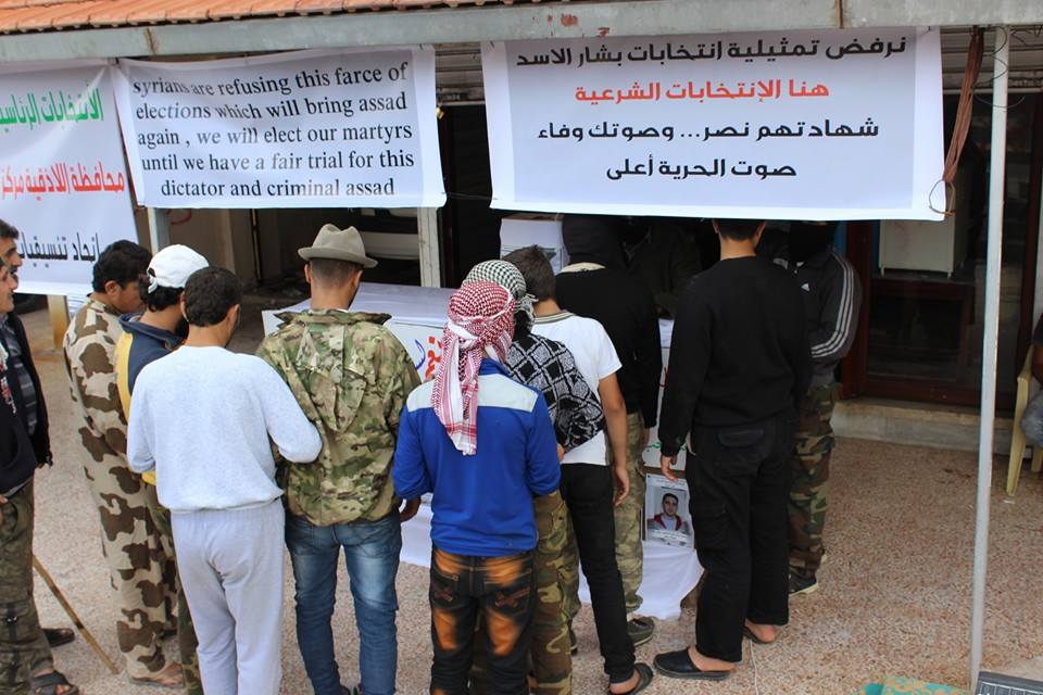 Heroes and revolutionaries of Lattakia in its liberated suburbs voting for the martyrs who are the leaders and role models refusing the ludicrousness of Bashar Al-Assad farce in which is pretended to be democratic elections ..